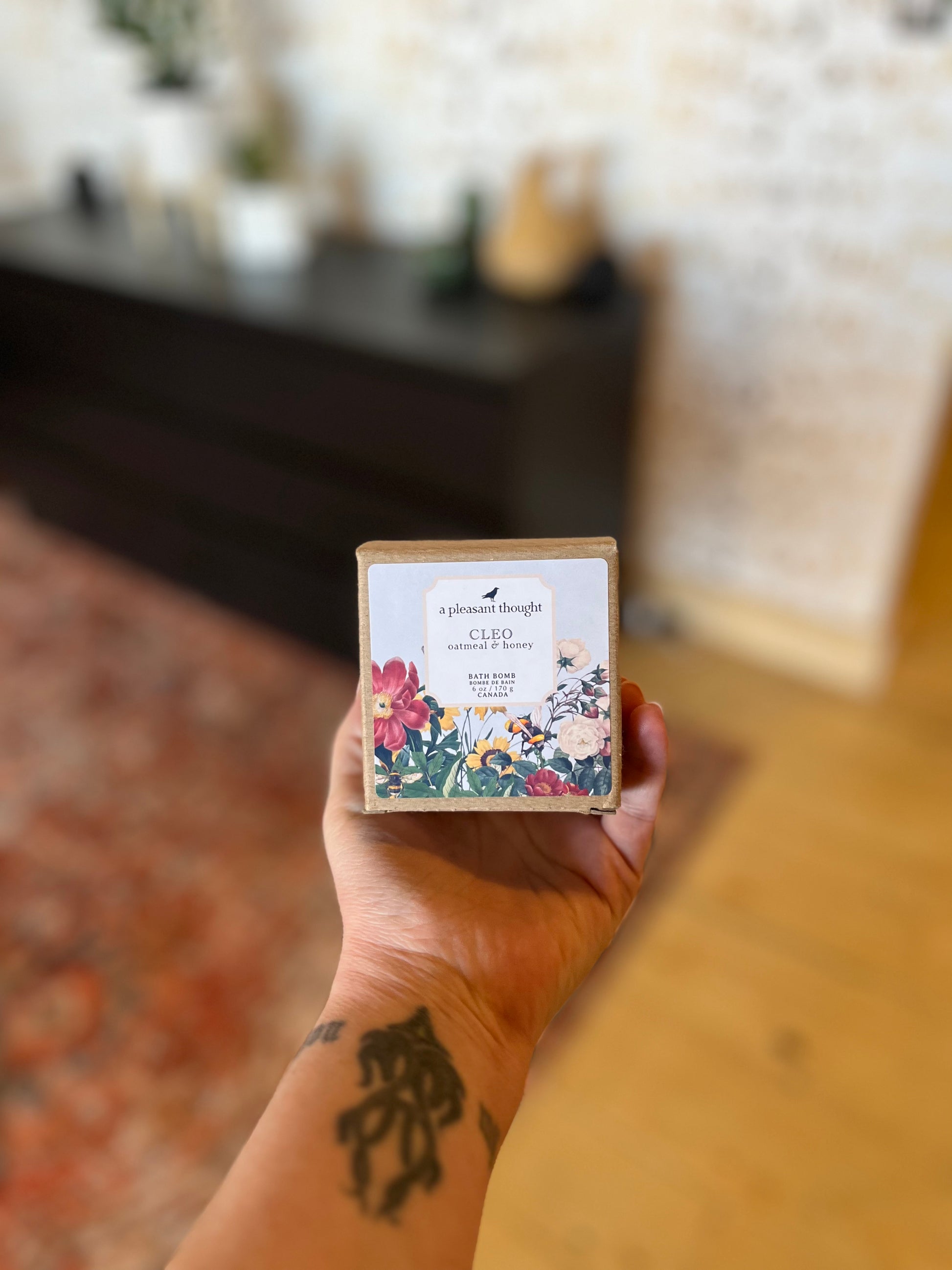 Warm and creamy with a soft powdery finish. Soak in the soothing essence of CLEO, our oatmeal, milk and honey scented, plant based, luxuriously foaming bath bomb. Garnished with oats.
